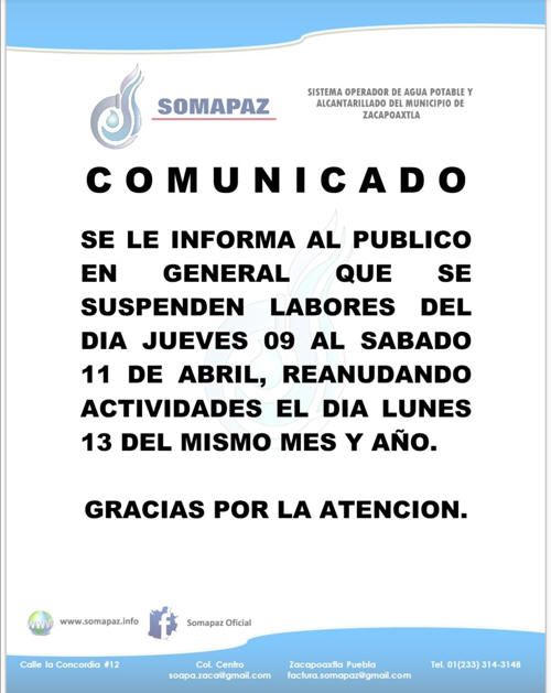 Pero el encierro también lo enfrentan las familias sin el servicio de agua potable en la mayoría de viviendas de la cabecera municipal, en donde se reporta que el agua dejó de llegar a los domicilios desde el viernes diez, sin que el Sistema Operador de Agua Potable y Alcantarillado del Municipio de Zacapoaxtla (Somapaz) emitiera ningún aviso. Respecto de la escasez de agua, el Somapaz se limitó a anunciar el 31 de marzo que la temporada de estiaje estaba por iniciar y recomendó a las familias cuidar el líquido, pero no se avisó del corte del servicio, como ya ocurre en la mayor parte de la cabecera municipal. Inclusive habitantes de la zona de Texpilco, El Fresno y La Palma, pidieron al Somapaz que revisara la falta del servicio, pero el Somapaz se limitó a responder que no se había suspendido el suministro y que los reportes serían revisados. Para este sábado once de abril, nuevamente no se cuenta con agua en el centro, situación que se vuelve aún más crítica debido al encierro de las personas que ordenó el Gobierno y el cierre de todos los centros turísticos de la región por la Pandemia del Covid-19. En cuanto al servicio de recolección de basura, el Ayuntamiento argumentó que el Relleno Sanitario ubicado en Cuyoaco, permanecería cerrado los días diez y once de abril, por lo que se espera se reanude la actividad para el lunes trece.