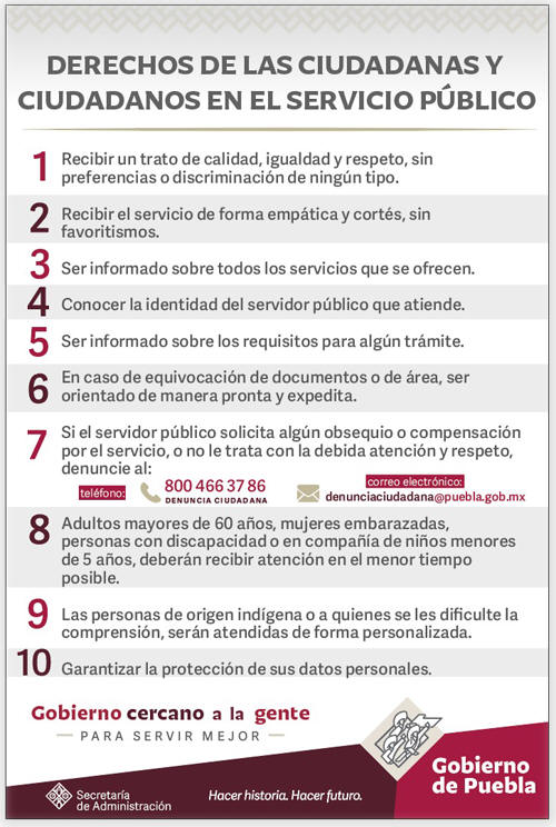 Presenta gobierno acuerdo de actuación de servidores públicos · La administración del gobernador Miguel Barbosa plantea que se conduzcan con legalidad, honestidad, austeridad, imparcialidad, objetividad y transparencia. · Deberán desempeñar sus funciones con respeto a los derechos humanos, con visión de género y erradicando cualquier forma de violencia en contra de las mujeres 12 Enero 2020 Puebla.- Con la finalidad de rediseñar el servicio público y que el ejercicio de la función pública se apegue a los principios de legalidad, honradez, lealtad, imparcialidad y eficiencia, el Gobierno del Estado presenta el acuerdo de actuación de las y los servidores públicos en el desempeño de sus funciones. El acuerdo, que entró en vigor el pasado miércoles 8 de enero, busca empoderar al ciudadano haciéndolo el eje de acción de la administración pública, colocándolo en el centro de la gestión estatal, considerando que lo más importante de la función pública es servir a las personas. Dentro de los lineamientos destaca que los servidores públicos deben de conducirse con legalidad, honestidad, austeridad, imparcialidad, objetividad, transparencia, certeza, cooperación, ética e integridad y sobre todo con calidad y calidez hacia las y los usuarios, a los que se les deben de ofrecer respuestas expeditas, claras y satisfactorias, y a quienes se les debe de garantizar el resguardo y protección de sus datos personales. Deben de abstenerse, además, de recibir, solicitar o aceptar cualquier tipo de compensación, dádiva, obsequio o regalo en la gestión y otorgamiento de trámites y servicios. También se establece que los funcionarios deben conducirse con estricto apego a la austeridad republicana, es decir, vivir en la sana medianía, evitando los derroches, la frivolidad y el dispendio; realizar su trabajo con honestidad, rechazando y denunciando cualquier acto de corrupción, sin favorecer a ningún ciudadano por motivos personales ni de ninguna índole. De igual forma el acuerdo contempla que deben desempeñar sus funciones con respeto a los derechos humanos, con visión de género y erradicando cualquier forma de violencia en contra de las mujeres; y servir a toda la ciudadanía por igual, de forma objetiva, empática y cortés, sin discriminación y sin distinciones por razón de raza, religión, identidad sexual, opinión pública, origen, posición económica o cualquier otra condición. Teniendo en cuenta que uno de los principales propósitos del gobernador Miguel Barbosa Huerta es concretar un gobierno incluyente y cercano a la gente, el acuerdo establece que los servidores públicos deben conocer y comunicar a la población los “Mecanismos de Atención Ciudadana” disponibles. Como parte de los compromisos de la administración estatal con los grupos con vulnerabilidad física, también se plantea que los servidores deben de implementar las medidas necesarias para garantizar la accesibilidad universal y que las gestiones se realicen en el menor tiempo posible para los adultos mayores de 60 años, mujeres embarazadas, personas con discapacidad y personas en compañía de niños menores de cinco años. Además, los servidores públicos deberán aprovechar al máximo el uso de las tecnologías de información y de comunicaciones para coadyuvar a transparentar la función pública y, en su caso, detectar con oportunidad prácticas de corrupción al interior de las instituciones públicas. Cuidar el aspecto personal en el trato con la ciudadanía, responder y utilizar lenguaje claro y sencillo y portar durante su horario laboral y de forma visible la credencial que los identifique, son otros aspectos que contempla el acuerdo. En cuanto a los titulares de las dependencias y entidades, deben garantizar que, en caso de que el servidor público solicite algún obsequio o compensación por el servicio ofrecido, los ciudadanos denuncien ante la autoridad competente, ya sea de forma verbal (en el número de 800 466 37 86), por escrito o por cualquier medio digital (denunciaciudadana@puebla.gob.mx). Debe subrayarse que la Secretaría de la Función Pública y los correspondientes Órganos Internos de Control, serán los encargados de vigilar el cumplimiento del acuerdo que establece los lineamientos de actuación de las y los servidores públicos en el desempeño de sus funciones.