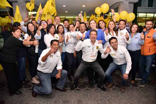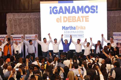 Al concluir el debate 2018, Martha Erika se reunió con los candidatos a Senadores, Diputados Federales, Diputados Locales, Ayuntamientos, así como amigas y amigos a quienes agradeció su apoyo en este trayecto en el que ha recorrido los municipios y ha escuchado las necesidades de los ciudadanos. De igual forma, indicó que con este ejercicio ganó Puebla y ganaron los ciudadanos, una vez que este permitió contrastar ideas y hablar de propuestas. “Amigas y amigos estamos prácticamente en la recta final, por alcanzar el triunfo pero hoy más que nunca debemos cerrar filas, debemos de trabajar incansablemente hasta el último minuto que nos lo permita la ley”. En este sentido, Alonso Hidalgo indicó que continuará recorriendo el estado hasta lograr el objetivo, por lo que instó a los presentes a no bajar la guardia y a cerrar filas para alcanzar la victoria el próximo 1ro. de julio. Finalmente, señaló que actuará con firmeza, para hacer valer el estado de derecho y garantizar la paz y tranquilidad de los poblanos. Cabe destacar que la acompañaron los candidatos Eduardo Rivera, Nadia Navarro, Mario Riestra, Roxana Luna, Roberto Ruiz Esparza, Jorge Aguilar Chedraui, Lupita Arrubarrena, Mariela Solís, Blanca Jiménez, Verónica Carbarín, Oswaldo Jiménez, Genoveva Huerta, Alejandra Escandón y Jesús Zaldivar.