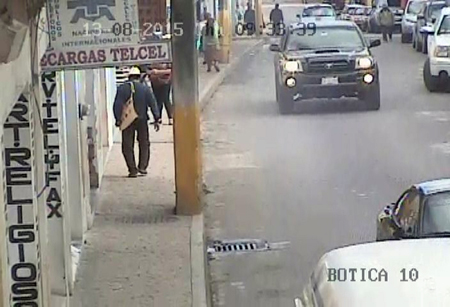 A las 9:40 horas, se apreció en las imágenes que una mujer salió de la sucursal Banamex y camina rumbo a la zona norte y de inmediato Pascual Flores la sigue y a la altura de la calle Rayón, se observa que se agacha, recoge un paquete y se acerca a la mujer, con el intento de engañarla de que se le había caído dinero de su bolsa.