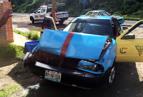 El conductor del taxi aseguró que se dirigía a Teziutlán, pero al llegar a una curva, se encontró con la colectiva de color blanco, la cual había invadido el carril, sin embargo no tuvo tiempo de evitar el impacto de frente, el cual provocó lesiones a dos de las pasajeras del taxi, por lo que de inmediato solicitó ayuda a través del teléfono de emergencia 911. Elementos de la policía municipal y la dirección de protección civil de Chignautla, acudieron al lugar del percance y en primer término estabilizaron a las dos mujeres, de quienes se dijo que se desconoce su identidad, ya que fueron trasladadas de inmediato a la ciudad de Teziutlán, en donde fueron internadas de urgencia en el hospital Guadalupano. El taxi color azul con amarillo y placas de circulación 8710-SSK del estado de Puebla, quedó en el lugar con daños materiales de consideración en la parte frontal, específicamente en el motor y sistema de enfriamiento, en tanto que se informó que la colectiva de urbanos de Teziutlán, se dio a la fuga.