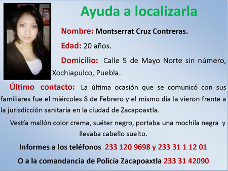 Los familiares relataron que Montserrat Cruz Contreras, se comunicó vía telefónica con su madre el pasado miércoles cerca de las 14:00 horas y acordaron encontrarse sobre la calle 16 de septiembre de la ciudad de Zacapoaxtla, sin embargo no se presentó y durante toda la tarde ya no se pudieron comunicar con ella y el teléfono mandó a buzón. Aseguraron que desde ese momento, amigos y otros familiares trataron comunicarse con ella vía teléfono y vía redes sociales, sin embargo no contestó. Se informó que vestía mallón color crema, suéter negro y portaba una mochila negra y de acuerdo a lo que la familia logró indagar, la última vez que fue vista fue en la base de las colectivas de la ruta Zacapoaxtla – Xochiapulco, que se ubica en la zona sur y caminó hacia el centro de esta ciudad. Se dio a conocer que cualquier información acerca de su paradero, se comuniquen al teléfono fijo 233 31 11201, al teléfono móvil 233 120 9698, al teléfono de la Comandancia de Policía en Zacapoaxtla 233 3142090 o al teléfono de emergencia 911.