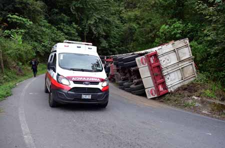 El percance se registró en el kilómetro 17+100 de la vía estatal, cuando el conductor de la unidad modelo 2014 con placas 52-AC-6K del servicio de carga, perdió el control cuando circulaba en una curva con dirección al municipio de Zacapoaxtla y se volcó sobre su costado derecho con más de 25 toneladas de mango. Paramédicos de Xochitlán acudieron al lugar y brindaron atención médica al chofer Juan Manuel Medina, quien comentó que al llegar a la curva, lo pesado de la carga provocó que el remolque con placas 80-TX-7M se cargara a su costado derecho y le fue imposible evitar la volcadura.