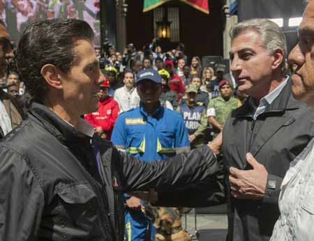 Adicionalmente, celebró el apoyo de los cuerpos de rescate que se sumaron a las tareas en la entidad, entre ellos personal de Protección Civil y Bomberos de Jalisco y Yucatán. En el evento estuvieron presentes los Secretarios de Gobernación, Miguel Ángel Osorio Chong; de la Defensa Nacional, Salvador Cienfuegos; de la Marina, Vidal Soberón y de Relaciones Exteriores, Luis Videgaray. También, el Comisionado Nacional de Seguridad, Renato Sales; el director general del Instituto Mexicano del Seguro Social (IMSS), Mikel Arriola; así como el Jefe de Gobierno de la Ciudad de México, Miguel Ángel Mancera, y los gobernadores del Estado de México, Alfredo del Mazo; Guerrero, Héctor Astudillo; Oaxaca, Alejandro Murat; Chiapas, Manuel Velasco y Morelos, Graco Ramírez, entre otros invitados especiales.