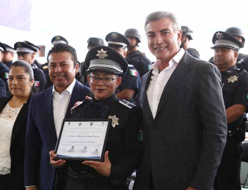 El mandatario reconoció la labor que realizan los elementos de esta corporación y celebró la promoción de grados policiales, así como los estímulos económicos que se otorgaron por acciones destacadas y constancias de capacitación. Tony Gali reiteró que no bajará la guardia para mantener el orden público y la sana convivencia social y refrendó su total apertura para dialogar con las autoridades electas, con el fin de trabajar conjuntamente en los programas y proyectos que se implementan en la entidad. Informó que derivado de la coordinación de los tres órdenes de gobierno para abatir el robo de hidrocarburos, se ha logrando -hasta el momento- el decomiso de 8 millones de litros de combustible aproximadamente, la recuperación de alrededor de 4 mil 200 vehículos y más de 2 mil tomas clandestinas selladas. El Presidente Municipal de San Andrés Cholula, Leoncio Paisano, agradeció al mandatario Tony Gali por establecer una labor permanente para resguardar la seguridad de los poblanos, con policías mejor equipados y especializados. Por su parte, la policía tercero de la Secretaría de Seguridad Pública y Tránsito Municipal de San Andrés Cholula, Andrea Cuaxiloa, celebró que las autoridades promuevan la profesionalización de los elementos, con el objetivo de optimizar su desempeño a favor de los habitantes. En el acto estuvieron presentes el alcalde de Puebla, Luis Banck; el Presidente del Tribunal Superior de Justicia, Héctor Sánchez; el Secretario de Seguridad Pública, Jesús Morales; el Fiscal General del Estado, Víctor Carrancá y el Coordinador estatal de la Policía Federal, Teófilo Gutiérrez. También la Presidenta del Patronato Sistema Municipal DIF de San Andrés Cholula, Leticia Zamora; el Presidente del Consejo Coordinador Empresarial (CCE), Carlos Montiel; de la 25 Zona Militar, Román Solís; así como los secretarios de Seguridad Pública y Tránsito Municipal de Puebla y San Andrés Cholula, Manuel Alonso y José Mario Méndez, respectivamente, entre otros invitados especiales.