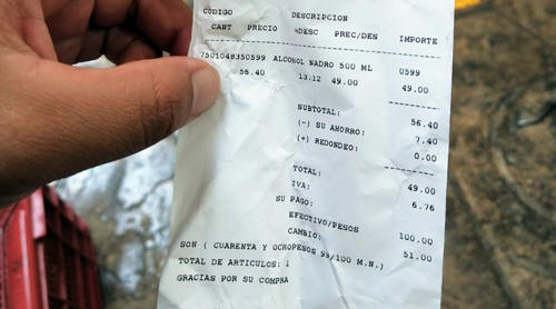 El litro de alcohol que costaba entre 40 y 48 pesos hasta mediados del mes de marzo, para este 16 de abril, las farmacias duplicaron el precio y lo venden en promedio a 100 pesos aprovechando la situación para generar ingresos, mismo caso de los cubrebocas, ya que la caja costaba 60 pesos y ahora cuesta en algunos lugares hasta 130 pesos. A la fecha persiste el desabasto de jabón para manos, el jabón que también se duplicó el precio en farmacias y comercios y el gel antibacterial que antes de la contingencia se encontraba en 70 u 80 pesos el litro y ahora se vende en algunos lugares hasta en 160 pesos el litro. El kilo de huevo que hasta hace 15 días costaba entre 25 y 30 pesos, se vende ahora en 42 y 50 pesos, por lo que es evidente que aunque el problema de aumentos se reporte a las autoridades de los tres niveles de gobierno, nada o muy poco se hace para evitar los abusos de comerciantes durante la Pandemia del Covid 19. En las imágenes de la nota una botella de medio litro con un precio de 49 pesos, correspondiente a una farmacia del centro de la ciudad.