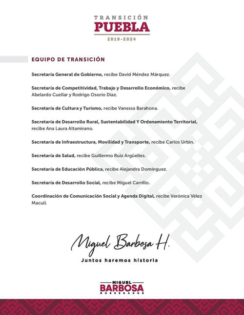 Presentan a integrantes del equipo de transición de Miguel Barbosa · Los trabajos comenzarán una vez que los gobernadores, electo e interino, lleven a cabo la reunión institucional para formalizar las agendas. 16 Junio 2019
