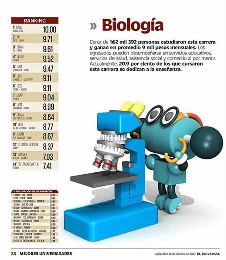Por su parte el programa académico de Licenciatura en Biología, se ubicó en el lugar 14, de entre las instituciones evaluadas.