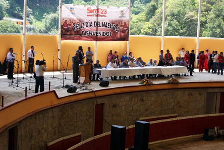 17 Mayo 2013 Zacapoaxtla.- Con la aportación de 95 mil pesos por parte del ayuntamiento para la rifa de cerca de 70 aparatos electrodomésticos, se realizó este viernes en la plaza de toros, el festejo del día del maestro, en donde el edil Armando Sánchez Jiménez, informó que para el mes de septiembre entregará un terreno para vivienda de los profesores y para la construcción de la clínica del ISSSTE.