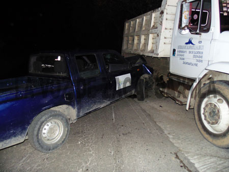 Mario Pérez Peralta, chofer de la camioneta doble cabina, placas de circulación XL-19827 del estado de Veracruz, relató que circulaba con dirección al crucero de la Cumbre, cuando el chofer del camión propiedad de Materiales de Zacapoaxtla Sociedad Anónima (SA) de Capital Variable (CV) modelo 2002, invadió su carril para ingresar a la comunidad de San Carlos del municipio de Zacapoaxtla.