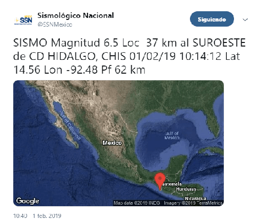 La Coordinación General de Protección Civil del Estado (CGPCE), dependiente de la SGG, en acciones conjuntas con la Fiscalía General del Estado (FGE), Secretaría de Seguridad Pública (SSP) y Bomberos, no reportaron daños. El Servicio Sismológico Nacional (SSN), precisó que la magnitud del movimiento telúrico fue de 6.6, 40 kilómetros al suroeste de ciudad Hidalgo, Chiapas, y se registró a las 10: 16 de la mañana. El Centro de Control, Comando, Comunicaciones y Cómputo (C5), reportó que los arcos de y subcentros de seguridad tampoco reportan afectaciones. Protección Civil del Estado y Seguridad Pública continuarán realizando recorridos para descartar algún daño.