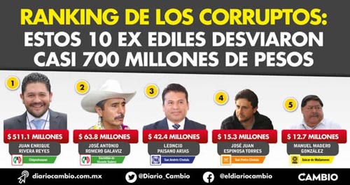 Lo anterior deriva de una lista que CAMBIO publicó el 29 de octubre, donde queda evidenciado que 21 ex presidentes de diferentes municipios incurrieron durante sus administraciones en fraude, asociación delictuosa, abuso de autoridad o incumplimiento de un deber legal, así como peculado. Los funcionarios son en su mayoría panistas y priistas y ya son investigados por la FGE. Figura José Antonio Romero Galaviz, ex presidente municipal de Xochitlán de Vicente Suárez, al cual se le atribuye un monto de 63 millones 827 mil 724.61 pesos. La Fiscalía investigará más a fondo este caso, especialmente porque la mayor parte de recursos que llegan a Xochitlán, son destinados para población indígena y se revisará la malversación que afectó a los habitantes de este municipio de la Sierra Nororiental. En la lista en poder de CAMBIO, el que más recursos tiene detectados por la ASE es el ex edil de Chignahuapan, Juan Enrique Rivera Reyes, cuyo monto atribuido es de 511 millones 110 mil 356.30 pesos. El priista encabeza la lista de mayor malversación de recursos durante su gestión 2014-2018. Cabe recordar que el ex alcalde también fue señalado como autor intelectual del ataque contra un hombre que resultó herido de bala en Tlaxcala, quien de acuerdo a información del periódico El Sol de Puebla, era pareja de su ex esposa. Paisano, el tercero en la lista por 42 millones Leoncio Paisano Arias, ex edil de San Andrés Cholula, es el tercero de la lista por ocupar facturas falsas, el monto detectado es de 42 millones 409 mil 408.12 pesos y corresponde a la contratación de 45 empresas proveedoras. En días pasados también fue señalado por los sanandreseños por desvío de recursos en obras públicas que nunca entregó. José Juan, el cuarto en la lista: pecó con 15 millones El cuarto en la lista de implicados por facturas falsas es José Juan Espinosa Torres, ex alcalde de San Pedro Cholula, que tiene un monto por aclarar de 15 millones 378 mil 516. 35 pesos. Además de Marcos Flores Morales, ex edil de Zacatlán, por un daño patrimonial de 5 millones 490 mil 785.75 pesos; Juan Navarro Rodríguez, ex presidente de Chalchicomula de Sesma, por un desvío de 5 millones 267 mil 505.34 pesos. Presidentes municipales han denunciado a sus antecesores: Barbosa Presidentes municipales del estado ya han presentado denuncias penales contra sus antecesores por diversas irregularidades como fraude y malversación de recursos ante la Fiscalía del Estado, detalló el gobernador Miguel Barbosa Huerta, quien además descartó que el Ejecutivo vaya a iniciar procedimientos aparte de los que la ASE ya empezó. Una de las denuncias la presentó la edil de San Pedro Cholula, Karina Pérez Popoca, contra Leoncio Paisano Arias; así como Melitón Lozano Pérez y Benjamín Hernández contra Manuel Madero González, de Izúcar; también Carlos Peredo Grau contra Antonio Vázquez, de Teziutlán, y Gustavo Vargas Cabrera contra Gabriel Alvarado Lorenzo, de Huauchinango. (Diario Cambio).