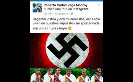 "Hagamos patria y exterminémoslos; ellos solo viven de nuestros impuestos sin aportar nada son unos chupa sangre", fue el mensaje que se lee en su red social seguido de una imagen con la bandera nazi y personas identificadas como voladores de Papantla.