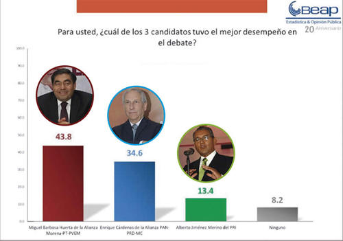 El candidato de la coalición Juntos Haremos Historia en Puebla, Luis Miguel Barbosa Huerta, fue el ganador del debate entre los aspirantes a la gubernatura del estado, pues de acuerdo con una encuesta telefónica realizada por la empresa Beap Estadística & Opinión Pública, tuvo el 43.8 por ciento de las preferencias. De acuerdo con la encuesta realizada a 400 poblanos a través de la vía telefónica, el 33 por ciento afirmó haber visto el encuentro entre los aspirantes a llegar a Casa Puebla, mientras que el 67 por ciento realizó otras actividades. Para el 43.8 por ciento de los poblanos que vieron el debate, Barbosa Huerta fue el aspirante que mejor desempeño tuvo, mientras que en la segunda posición se ubicó Enrique Cárdenas Sánchez con el 34.6 por ciento y en un lejano tercer lugar se encontró el abanderado del PRI, Alberto Jiménez Merino, con el 13.4 por ciento. De esta manera, Luis Miguel Barbosa se perfila para convertirse en el próximo gobernador del estado, ya que a pesar de los ataques recibidos por Cárdenas Sánchez y Jiménez Merino, se mantuvo al frente de las preferencias de los poblanos para llegar a Casa Puebla.