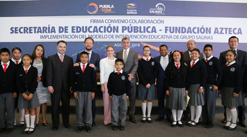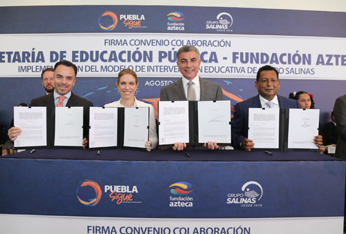 En su mensaje, el mandatario destacó que esta estrategia ofrece herramientas para la inserción de nivel bachillerato en el rubro del saber científico, tecnológico, artístico-cultural y deportivo, impulsando la excelencia académica de estudiantes de escasos recursos. Informó que actualmente se construye el edificio que albergará la primera Escuela de Talentos Azteca-Puebla que recibirá, de manera inicial, a 30 alumnos destacados y se ubicará en la localidad de San Lorenzo Almecatla, perteneciente al municipio de Cuautlancingo. Indicó que los estudiantes contarán con instalaciones modernas y equipadas, así como áreas para el desarrollo de actividades artísticas y culturales como el Aula Maker, el Club de Robótica, además de poder integrarse a la Orquesta y Coro Esperanza Azteca. En su intervención, la senadora Ninfa Salinas celebró la voluntad del gobernador Tony Gali de hacer posible que se ejecutara este proyecto de manera ágil, que contribuirá a que más jóvenes cumplan sus sueños. El Secretario de Educación Pública, Ignacio Alvízar, reconoció que este modelo impulsa un alto desempeño en los jóvenes y promueve una educación de inclusión, otorgando becas para potenciar las habilidades de los alumnos en situación vulnerable. En representación de los alumnos, María Elena Asunción Herrera, agradeció a las autoridades por apoyar estas acciones que les brindan mejores oportunidades. En el acto estuvieron presentes el alcalde de Puebla, Luis Banck; el Director General de Fundación Azteca, Antonio Domínguez; el subsecretario de Educación Obligatoria, Álvaro Álvarez; así como la Directora del Plantel Azteca Puebla, Araceli Torre Blanca. También la diputada federal del estado de Querétaro, Alma Lucía Arzaluz; el director general de Educación Media Superior y Superior de Morelos, Héctor Fernando Espín y el encargado de despacho de la dirección general del Comité Administrador Poblano para la Construcción de Espacios Educativos (CAPCEE), Gustavo Guzmán.
