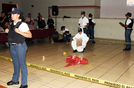 En la demostración que se presentó ante autoridades de municipios de la región, se mostró la manera en que se debe realizar el procedimiento para preservar intacto el lugar de los hechos, el levantamiento de indicios, la captura de imágenes por parte de los policías y la elaboración de la cadena de custodia con previa autorización y conocimiento de un agente del ministerio público.