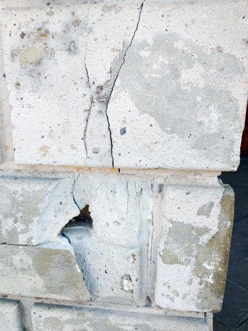 Mientras en Presidente con licencia Ebodio Santos Alejo, anda en campaña por diferentes municipios de la región, pequeños trozos de la cantera que fue traída de Apulco hacía el centro de Zacapoaxtla, se desprende y poco a poco crecen las afectaciones sobre las columnas del Palacio. Actualmente se observa una gran cantidad de clavos, algunos que provocaron el desprendimiento de partes de la cantera, inclusive se observan cuarteaduras en las columnas, especialmente en las ubicadas en la parte sur del Palacio.