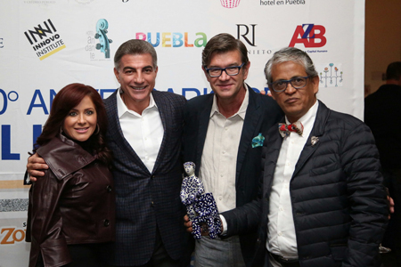 Acompañado por su esposa, Dinorah López de Gali, encabezó la celebración del décimo aniversario de la escultura "El hombre azul" del artista plástico boliviano José Bayro, a quien expresó su reconocimiento por contribuir con el arte en Puebla.