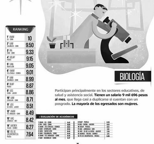 La carrera de Licenciatura en Biología ocupó para este 2018 el lugar número 15 en el ranking y al respecto la coordinadora de la carretera Rosario Aidé García Pérez, comentó que a nivel nacional la carrera la ofertan más de 60 instituciones de educación superior y el lugar que ocupó el Tec Zacapoaxtla es una muestra del buen nivel académico de la institución. Expresó que cuentan con la infraestructura adecuada para brindar educación de calidad a los estudiantes y destacó que actualmente, los egresados se pueden titular en dos especialidades que son Biotecnología y la segunda Uso y manejo de la Biodiversidad, lo que representa una mejora en la oferta académica de este Tecnológico. La jefa de carrera expresó que el ranking otorga los lugares en base a diversas evaluaciones, primero que las carreras estén acreditadas por organismos nacionales e internacionales, que se cuente con proyectos de investigación en desarrollo y sobre todo el nivel de preparación del personal docente que imparte las cátedras. También se evalúan a los empleadores y a los alumnos egresados para evaluar la preparación que se les brindó y también se aplican entrevistas a los docentes para conocer su nivel de preparación de las materias que imparten.