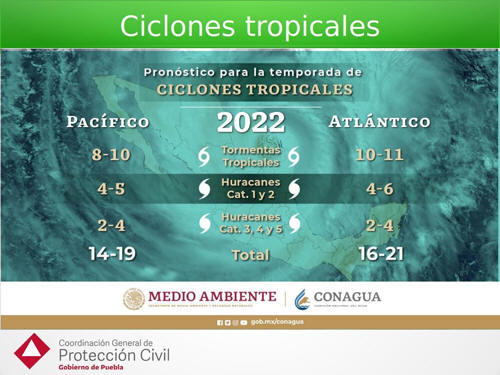La temporada inició el pasado 15 de mayo y se tiene proyectada la presencia de hasta 11 ciclones tropicales en el Atlántico, entre 4 y 6 huracanes categorías 1 y 2 y entre 2 y 4 huracanes que podrían desarrollar vientos que pueden alcanzar categorías 3, 4 o 5. En el caso del Océano Pacífico, se pronostican hasta 10 tormentas tropicales, 4 o 5 huracanes con categorías 1 y 2 y entre 2 y 4 huracanes que pueden alcanzar las categorías 3, 4 o 5 en la escala Saffir – Simpson. Ante este panorama, el SMN, órgano dependiente de la Comisión Nacional del Agua (Conagua) pidió a las autoridades de Protección Civil de todo el país, actualizar sus mapas de riesgo, identificar a las familias que habitan zonas peligrosas, notificarles de la situación que se espera y tomar todas las medidas necesarias para evitar muertes por deslaves, inundaciones o caída de árboles.