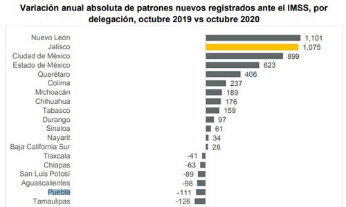 Así lo reflejan datos del IMSS generados entre octubre de 2019 y el mismo mes de 2020. Las bajas ubican a la entidad en el lugar número 15 a nivel nacional con más empresarios afectados y que determinaron bajar la cortina de su negocio ante la imposibilidad de seguir operando. Guanajuato se encuentra en primer lugar nacional con más pérdida de empresas con mil 11, después Veracruz con 778 y la tercera posición corresponde a Sonora con 648 compañías. En contraste, Nuevo León se encuentra en primer lugar en octubre de 2020 en comparación con el año anterior en generar mil 101 registros de nuevos patrones. En segunda posición está Jalisco con mil 75 y en tercer lugar Ciudad de México con 899 empresas. Más empresas pérdidas que recuperadas La situación económica en Puebla generó que más patrones se dieran de baja ante el IMSS, que los nuevos registrados.