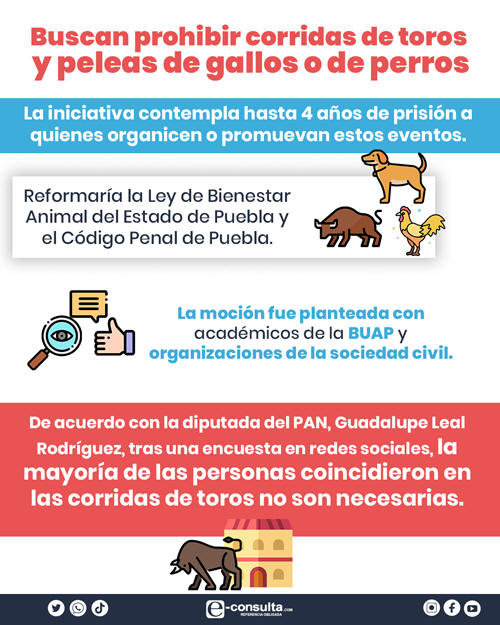 La iniciativa se presentó este jueves en el Congreso del estado y propone reformar los artículos 8, 16, 18, 19 y 94 de la Ley de Bienestar Animal del Estado; y los artículos 470, 473 y 474 del Código Penal del Estado. La diputada local argumentó que tras realizar encuestas ciudadanas y en redes sociales, la mayoría de las personas coincidieron en las peleas de toros no son necesarias. La iniciativa propone que en la Ley de Bienestar Animal se modifique el artículo 18 para que la tauromaquia y las peleas de gallos se integren al catálogo de conductas sancionables, por considerarlas de crueldad y maltrato animal. De aprobarse las reformas, las personas que realicen estos eventos también podrían ser acreedoras a multas de 200 a 400 Unidades de Medida y Actualización (UMAS), que equivalen, de 19 mil 244 pesos a 38 mil 488 pesos, y la sanción podría aumentar en un tercio cuando los animales sean utilizados para espectáculos. Guadalupe Leal aseguró que, de acuerdo con los estudios realizados por la organización “Puebla Sin Tauromaquia”, no habrá un impacto negativo en el ámbito económico, ya que 259 ganaderías de toros de Lidia que son utilizados para la tauromaquia, solo tienen promedio cuatro ventas de animales por año a eventos taurinos, mientras que las peleas de gallos suceden, de forma legal, con poca frecuencia. Además, dijo que con estas reformas las denuncias podrían ser realizadas por la propia ciudadanía a través de escritos, medios audiovisuales, medios electrónicos oficiales, por comparecencias o cualquier otra evidencia análoga que determine el Instituto de Bienestar Animal. No castigarían competencias Solo podrán calificarse como excepciones, aquellos espectáculos de charrería o competencias, cuya finalidad sea mostrar las habilidades, características de conformación, movimientos o doma de animales, o bien habilidades de personas en el jineteo. Esta iniciativa fue planteada en conjunto con el Instituto de Ciencias Ecuestres; el Cuerpo Académico 330 “Prevención de la Violencia: Educando para una Cultura de Paz a través de la Participación Social”, del Instituto de Ciencias Sociales y Humanidades “Alfonso Vélez Pliego” de la BUAP, y agrupaciones sociales como Movimiento Animalista de Puebla, que reúne a 111 organizaciones de la sociedad civil. La propuesta fue presentada ante el Legislativo local a un año de que regidores del PAN frenaron la iniciativa de la exalcaldesa de Puebla, Claudia Rivera Vivanco, quien buscaba precisamente prohibir las corridas de toros en el municipio. El freno a la iniciativa fue respaldado en ese entonces por el gobernador Luis Miguel Barbosa Huerta, a pesar de que en su campaña de 2018 firmó la Agenda Animalista de organizaciones civiles, que comprometían a candidatos a promover la prohibición de la “Fiesta Brava”. (e-consulta).