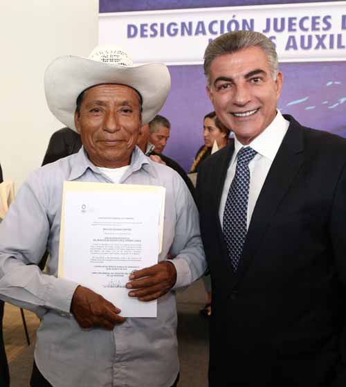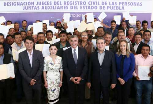 Con ello suman 541 jueces acreditados que, bajo un modelo integral de formación y evaluación, aprobaron las capacitaciones para la devolución del Registro Civil a las juntas auxiliares del estado. Dicha acción representa una inversión de más de 9 millones de pesos, con el propósito de brindar certeza jurídica a los actos del Registro Civil, en apego al marco legal vigente, y bajo el uso de nuevas tecnologías para proteger y atender eficazmente las demandas ciudadanas. El Ejecutivo mencionó que las reformas, entrenamiento y diseño realizados reconocen nuevamente las funciones de los presidentes auxiliares, como autoridades coadyuvantes del Registro Civil, quienes tienen la facultad para celebrar actos como: constancias de nacimientos, matrimonios, defunciones y demás servicios públicos de calidad en sus localidades. Finalmente reiteró el llamado para emprender y consolidar acciones que beneficien, protejan y den solución a las necesidades de las personas de los 217 municipios y cada una de sus juntas auxiliares, para seguir avanzando por la ruta del progreso. El Secretario General de Gobierno, Diódoro Carrasco Altamirano, puntualizó que el gobierno de Tony Gali cumple con el ejercicio de la función pública en temas estratégicos de Registro Civil, así como el compromiso político de devolver las atribuciones y facultades para ejercer responsablemente en sus comunidades. Estuvieron presentes la Diputada Presidenta de la Comisión de Gobernación y Puntos Constitucionales del H. Congreso del Estado, Susana Riestra Piña; la Subsecretaria de Desarrollo Político de la Secretaría General de Gobierno del Estado, María de los Ángeles Mendoza Escalante; el Director General del Registro del Estado Civil de las Personas, Víctor Kuri Bujaidar; así como el presidente auxiliar de San Juan Huiluco, del municipio de Huaquechula, en representación de los presidentes de las juntas auxiliares del estado, Abel Aguilar Gómez y el presidente auxiliar de San Pedro Tepetzingo-Tehuacán, Erick Roque Mendoza; entre otros.