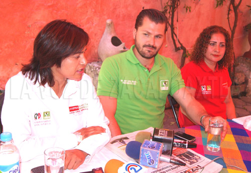 La primera propuesta es convertir a los vales para medicina en un programa social, para que aunque el senado no lo apruebe, se destinen recursos para que la gente cuente con medicamentos después de una consulta, el cual dijo que Peña Nieto pondrá en operación esta propuesta desde un principio en caso de que obtengan el triunfo el próximo un de junio. Recordó el lema de su partido “Si el gobierno no te da las medicinas, que te las pague”, por eso se convertirá en programa social y será una garantía para los pacientes. La segunda es que se aplique cadena perpetua para secuestradores. Recordó que el Partido Verde ya logró que se le aplicaran 70 años de cárcel a los delincuentes, sin embargo puso de ejemplo que a la sociedad no le gustaría que un secuestrador de 20 o 25 años sea detenido, y en 30 años saliera de la prisión cerca de los 50 años, por eso dijo que es fundamental que a los secuestradores se les de cadena perpetua y se les obligue a realizar labores de servicio comunitario al interior de los penales. La tercera propuesta es exigir a los directores de las escuelas que dejen de solicitar cuotas en las escuelas, para lo cual proponen que se destine más recursos para todos los gastos necesarios de las escuelas y que los padres de familia dejen de aportar cuotas. La cuarta propuesta es que exista mayor infraestructura, que se destinen más recursos a garantizar el abasto de agua al mayor número de mexicanos con la realización de obras para eficientar los sistemas de agua potable y que se cuide que llegue a todos los hogares y se desperdicie por falta de una red en buen estado. La quinta es que se sancione a las empresas que contaminen los ríos y arroyos de este país, “el que contamine debe pagar y resarcir el daño a los manantiales”, ya que aseguró que se debe evitar que desechos tóxicos sigan contaminando los ríos, porque el medio ambiente es de todos porque lo mínimo que le podemos dejar a los hijos y nietos es un medio ambiente sano, finalizó Juan Carlos Natale. Fotos: Josefina García Hernández, candidata a la diputación por el distrito IV; Juan Carlos Natale, dirigente estatal del Partido Verde y Lucía Cruz Arroyo candidata suplente a la diputación.
