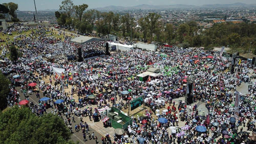 Acompañado de la dirigente nacional de Morena, Yeidckol Polevnsky, del diputado federal y presidente de la Junta de Coordinación Política de la Cámara de Diputados, Mario Delgado, así como de los presidentes nacionales de los Partidos Verde Ecologista y del Trabajo, Carlos Alberto Puente y Alberto Anaya, respectivamente; el abanderado se dirigió a las casi 100 mil personas que se reunieron en este cierre de campaña estatal en la Plaza de la Victoria de la Unidad Cívica 5 de Mayo a quienes dijo: “sonrían porque vamos a ganar. En el 2018 les dije que no iba a cansarme, que no me iba a rajar y no me iba a abrir, que llegaría hasta donde topara y topamos con mucho; aquí estamos, este ganso no se cansa y con su voto este 2 de junio vamos a ganar”.