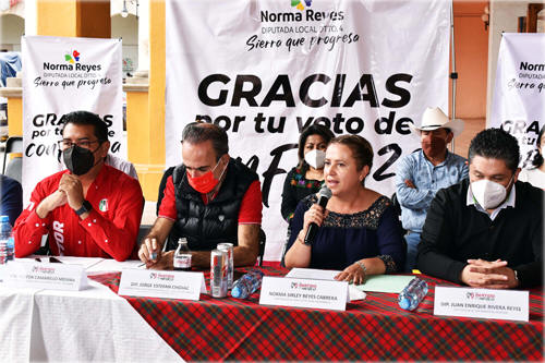 En Rueda de Prensa realizada este domingo, el Coordinador de los Diputados del PRI, Jorge Estefan Chidiac, felicitó a la diputada de Zacapoaxtla, quien además fue electa Pro Secretaria de la Primera Mesa Directiva del Congreso del Estado, integrada solamente por mujeres. De igual manera la diputada de Zacapoaxtla, forma parte de las comisiones de Desarrollo Social, Desarrollo Rural, Salud y también será la Secretaria de la Comisión de Seguridad Pública en el Congreso Poblano, privilegio que dijo Estefan Chidiac, se verá reflejado en mejores condiciones de vida para los municipios del Distrito 04. El Presidente Estatal del PRI y Diputado Local, Néstor Camarillo Medina, dijo que Norma Reyes Cabrera, fue una mujer disciplinada con el partido antes de las elecciones y gracias al trabajo de ella y su equipo de trabajo, lograron ganar las elecciones, a pesar del intento de fraude en el Consejo Electoral para favorecer al candidato de Morena, Ebodio Santos.