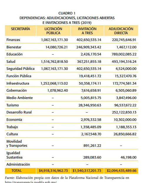En la investigación que esta tarde se presentó en plataformas digitales y Facebook, los autores del libro —la abogada Itzel Jiménez y el periodista Sergio Mastretta—sostienen que la administración de Miguel Barbosa Huerta se ha mostrado poco comprometida con la transparencia y la rendición de cuentas, abriendo la puerta a favoritismos y actos de corrupción. La organización revisó en el portal de transparencia del gobierno del estado y la Plataforma Nacional de Transparencia para analizar las adquisiciones contratadas por 17 dependencias y 24 organismos públicos descentralizados del estado en los años de 2019 y 2020. En el libro se presentan las gráficas y cuadros de las adquisiciones que concluyen que 1 de cada 4 contratos suscritos por las secretarías dependientes del Ejecutivo estatal se adjudicó de manera directa en 2019, y casi 4 de cada 10 en 2020. Las adjudicaciones directas de los organismos públicos descentralizados ascendieron en 2019 a 1 mil 102 millones de pesos (35.2%) y de enero a noviembre de 2020 ese porcentaje aumentó al 59.4 % con 494 millones de pesos, contra 336 millones que pasaron por la licitación a tres empresas. “No todo se licita bajo condiciones de competencia, como lo establece la ley. De hecho, cada vez se licita menos”, asientan los autores en el libro. “Con la pandemia del Covid-19 la opacidad ha sido total. De los 2 mil 724 millones de pesos aplicados por el gobierno en 2020 a la emergencia del Covid-19 no existe un contrato publicado ni se puede identificar si se realizó por la vía de la licitación o la adjudicación directa”. Las anomalías de SEP y Finanzas La Secretaría de Educación y la Secretaría de Planeación y Finanzas destacan con más casos de adjudicación directa. Desde 2019, la Secretaría de Educación, a cargo de Melitón Lozano Pérez, es la que recibe la mayor cantidad de presupuesto y que tiene más recursos adjudicados de forma directa: 789 millones de pesos, que contrastan con apenas 2.4 millones que licitó bajo el formato de invitación a tres. La Secretaría de Educación no realizó un solo concurso de licitación pública abierta en 2019. En tanto, la Secretaría de Planeación y Finanzas, de María Teresa Castro Corro, destaca que en 2019 recibió 7 mil 871 millones de presupuesto, del cual adjudicó de forma directa 220 millones, frente a los 1 mil 510 millones de pesos que se licitaron, de los cuales más de 402 millones se otorgaron mediante invitación a tres personas. “Sólo 1 mil 67 se licitaron de forma pública abierta”. “Las secretarías de Turismo, encabezada por Vanessa Barahona de la Rosa; Desarrollo Rural, por Ana Laura Altamirano Pérez, y Cultura, que en 2019 estaba representada por Julio Glockner, adjudicaron de forma directa más de lo que licitaron por invitación a tres proveedores, y ninguna de ellas registraron procedimientos de licitación pública abierta en el año 2019”, asienta la investigación de esta ONG que tiene como director a Enrique Cárdenas Sánchez, ex rival de Miguel Barbosa Huerta en las elecciones extraordinarias por la gubernatura de Puebla de ese año. Sólo las secretarías de Finanzas, Bienestar, Salud, Seguridad Pública, Infraestructura y Gobernación licitaron de forma abierta en 2019, mientras que las demás secretarías adjudicaron la totalidad de los contratos por invitación a tres o adjudicaciones directas. No obstante, la situación es bastante más grave para el año 2020 pues, además de que se está transparentando 8.3 veces menos, las secretarías de Finanzas, Salud, Infraestructura y Administración no han dado de alta un solo contrato. Los autores sostienen que el gobierno del estado sólo ha transparentado el 20 de sus adquisiciones en 2019 y 2020. Malas prácticas en el DIF y CAPCEE