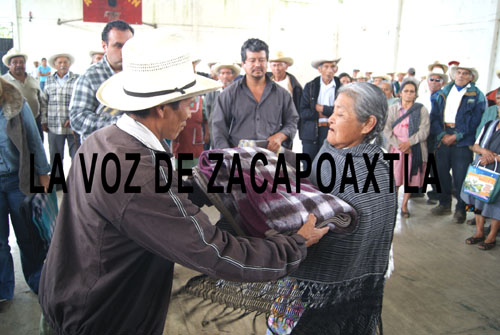 Zacapoaxtla.- Como parte de las actividades para celebrar el día del adulto mayor, el ayuntamiento entregó este martes, cobijas a 2 mil 600 personas mayores de 60 años, en cada una de las seis juntas auxiliares y 22 comunidades del municipio.