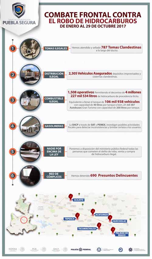 En estos operativos, se han asegurado 2 mil 305 vehículos, 787 tomas clandestinas fueron selladas y 690 personas han sido puestas a disposición de la Procuraduría General de la República. Tan solo en la semana del 23 al 29 de octubre fueron decomisados 112 mil 378 litros de combustible ilegal, se aseguraron 21 vehículos, se sellaron cinco tomas clandestinas y seis presuntos delincuentes fueron detenidos, en un total de 19 operativos. De esta manera, Puebla Segura reitera su voluntad permanente de combatir la delincuencia organizada hasta sus últimas consecuencias.