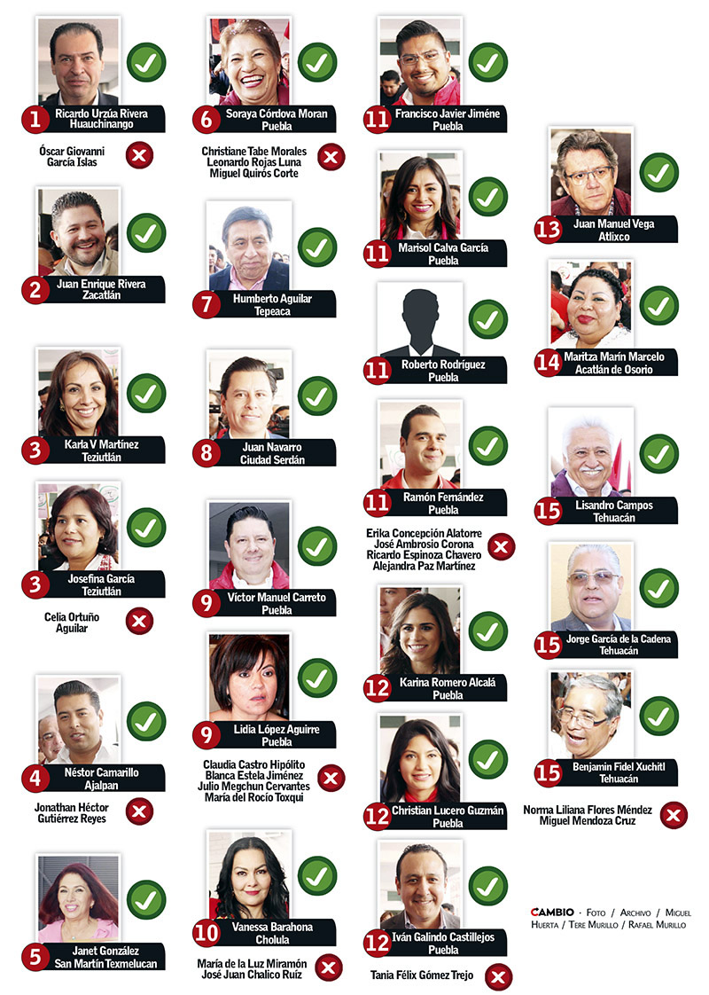 PRI alcanza unidad en 10 distritos y en 5 habrá disputa 31 Enero 2018 Puebla (Diario Cambio).- El tricolor alcanzó postulaciones de unidad en 10 distritos federales en los que fue validado el registro de un solo aspirante. Sin embargo, en otros 5 se prevé jaloneo al abrir a dos o más. Entre esos distritos problemáticos se encuentran los correspondientes a Teziutlán, Tehuacán y los 9, 11 y 12 de Puebla. En este último, los regidores Karina Romero e Iván Galindo se dan con todo por la nominación. Este martes se dio a conocer que en el primer filtro fueron ‘cepillados’ 19 de los aspirantes y otros dos (Víctor Emanuel Díaz Palacios y Marcelino Israel Garzón Martínez) no aparecen en ninguna lista. Los perfiles que deberán hacer un segundo examen sobre la labor legislativa a la que aspiran son personajes ya experimentados que según fuentes del partido tienen un lugar asegurado por tener padrinos políticos como el ex gobernador Mario Marín Torres, la ex senadora Blanca Alcalá Ruiz y el aspirante al Senado, Juan Carlos Lastiri Quirós. Algunos como Ricardo Urzúa Rivera, quien busca abanderar el distrito 1 con cabecera en Huauchinango; los alcaldes con licencia de Chalchicomula de Sesma, Juan Navarro (distrito 8 Ciudad Serdán); Néstor Camarillo de Quecholac, aspirante por el distrito 4 por Ajalpan son priistas que buscan brincar a otro cargo y algunos de los que ya tienen el aval. Allegados de Lastiri, Marín y Blanca; los palomeados De los 45 aspirantes a la diputación federal, sólo 24 pasaron el primer filtro, 19 fueron ‘cepillados’ y dos aspirantes – Marcelino I Garzón Martínez y Víctor Díaz Palacios – ni siquiera aparecen en la lista que publicó el Comité de Procesos Internos del tricolor. Entre los procedentes que están ‘palomeados’ para ir en la boleta del primero de julio, se encuentra la regidora con licencia e hija de Blanca Alcalá, Karina Romero Alcalá. También figura Vanessa Barahona quien va por el distrito 10 de Cholula y una “recomendada” de Juan Carlos Lastiri, ex subsecretario de la Sedatu. Otros que “pasaron” el primer filtro son los Antorchistas Soraya Córdova Morán (distrito 6 con cabecera Puebla) y Lisandro Campos Córdova quien busca competir por el distrito 15 por Tehuacán. Los que no tienen padrinos políticos como Christian Tabe Morales (distrito 6), Celia Ortuño Aguilar (distrito 3), Jonathan Héctor Gutiérrez Reyes (distrito 4), entre otros, quedaron fuera. Con irregularidades PRI publica la lista de los aspirantes cepillados A pesar de que en la lista proporcionada por el dirigencia local al cierre del proceso consta que Marcelino Israel Garzón Martínez se inscribió el sábado 27 de enero a las 12:17 horas por el distrito 15 con cabecera en Tehuacán y Víctor Emanuel Díaz Palacios, el domingo 28 de enero a las 10:38 horas por el distrito 3 con cabeza en Teziutlán, ambos no aparecen en el documento publicado por la Comisión Nacional de Procesos Internos. Marcelino Israel Garzón es el actual presidente del Consejo Nacional de Sociedades y Unidades con Campesinos y Colonos (Conscc) mientras que Víctor Díaz Palacios quiere volver a ser reelegido como legislador federal pues ya ocupó este cargo también por el distrito 3 en el periodo 2012-2015.