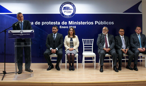 Con la toma de protesta de los Ministerios Públicos que ya están en funciones desde el primero de enero, la Fiscalía General refrenda el compromiso de hacer frente a los desafíos del Sistema de Justicia Penal Acusatorio, cuya implementación en Puebla ha significado que incluso la PGR reconozca que la entidad destaca como una de las mejores del país, valorando el desempeño a pesar de limitantes presupuestales y de personal. En el evento estuvieron presentes: María Eugenia Calderón Oliman, Fiscal de Asuntos Jurídicos y Derechos Humanos; Enrique José Flota Ocampo, Fiscal Anticorrupción; Fernando Rosales Solís, Fiscal de Secuestro y Delitos de Alto Impacto; Jaime Huerta Ramos, Fiscal de Investigación Regional; y Gustavo Luis Huerta Yedra, Fiscal de Investigación Metropolitano.