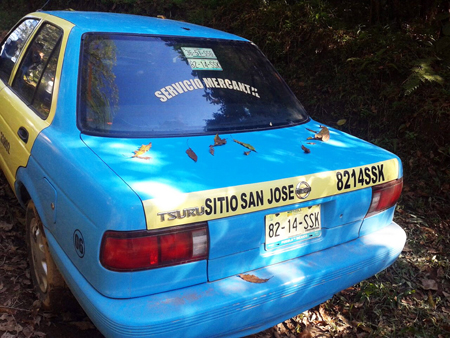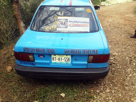 El primer taxi marca Nissan, tipo tsuru, fue encontrado en Chicueyaco, perteneciente a la junta auxiliar de Acaxiloco, el cual pertenece al sitio San Miguel Tenextatiloyan del municipio de Zautla, con placas de circulación 8761-SSK, con número de concesión 30904, el cual fue robado el pasado 25 de enero en Tlatlauquitepec, donde de acuerdo al reporte policiaco, sujetos armados amagaron al chofer y se llevaron la unidad.