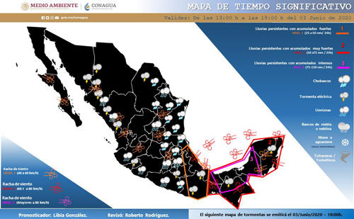 El Servicio Meteorológico Nacional (SMN) pronostica lluvias de hasta 75 litros por metro cuadrado para este tres de junio y para los días siguientes también se esperan lluvias intensas para la Sierra Nororiental y Sur del estado de Puebla, además de lluvias extraordinarias de hasta 250 litros por metro cuadrado en Tabasco y Campeche. Deberán entonces las autoridades, analizar las medidas más acertadas para proteger a los ciudadanos en este inicio de la temporada de ciclones y huracanes 2020 y al mismo tiempo, evitar las aglomeraciones que recomiendan para los ciudadanos, para evitar contagios de Coronavirus. Además de la tormenta “Cristóbal”, el SMN anunció que un canal de baja presión, en interacción con el ingreso de humedad de ambos litorales, originarán lluvias puntuales fuertes a muy fuertes acompañadas de actividad eléctrica, vientos arrachados al paso de las tormentas y posibles granizadas sobre algunos estados del noreste, centro y oriente del territorio nacional.