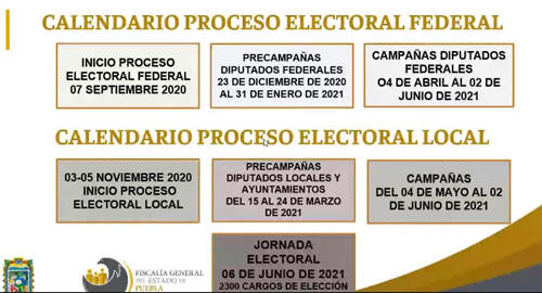 Este martes tres de noviembre inició el proceso electoral local, y será del 15 al 24 de marzo que se lleven a cabo las precampañas para los candidatos a las 26 diputaciones locales y a los 217 ayuntamientos del estado, y será del cuatro de mayo al dos de junio que se realizarán las campañas y finalmente las elecciones el domingo seis de junio. Este lunes tres de noviembre, personal de la Fiscalía Especializada en la Investigación de Delitos Electorales (FEIDE), ofreció un curso de capacitación a funcionarios de los ayuntamientos de la Sierra Nororiental, a través del cual expuso las principales acciones consideradas delitos electorales. Cabe recordar que el próximo seis de junio también se elegirán a los 15 diputados federales que representan a Puebla en la Cámara de Diputados, sin embargo el proceso electoral federal inició desde el pasado siete de septiembre, las precampañas serán del 23 de diciembre de 2020 al 31 de enero de 2021. En el caso de las campañas a diputados federales, serán del cuatro de abril al dos de junio próximos, para los tres días de veda y finalmente los ciudadanos puedan votar el seis de junio. Se elegirán en todo el país 500 diputados, 300 por voto directo y 200 por representación proporcional, y en el estado 41 diputados, 26 por voto ganado en las casillas y 15 por representación proporcional. De esta manera inicia la carrera en la renovación de puestos de elección popular, en el cual los servidores públicos que deseen participar para ocupar un nuevo cargo, deberán renunciar 90 días antes.