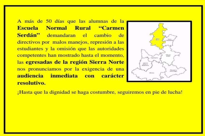 Teteles de Ávila Castillo.- Estudiantes de la escuela Normal Rural “Carmen Serdán” de Teteles, dieron a conocer que la falta de respuesta de los gobiernos Federal y Estatal desde hace dos meses, provocaron que se manifestaran en la ciudad de México y ahora sobre la pista Puebla – Teziutlán.