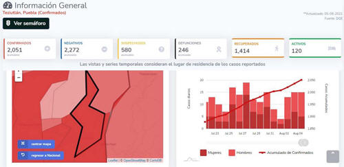 En el portal de la Secretaría de Salud, la información de todos los municipios de la región, coincide que la curva de contagios se incrementó a partir de la segunda semana de Julio, especialmente entre personas de un rango de edad entre los 20 y los 45 años de edad. Para los primeros días de Agosto, el Hospital de Teziutlán, informó a los Ayuntamientos de la región, que ya no cuentan con capacidad de atención a los pacientes de esta enfermedad, por lo que ante casos de emergencia, se deberán canalizar a Hospitales Covid como Tehuacán o Cholula.