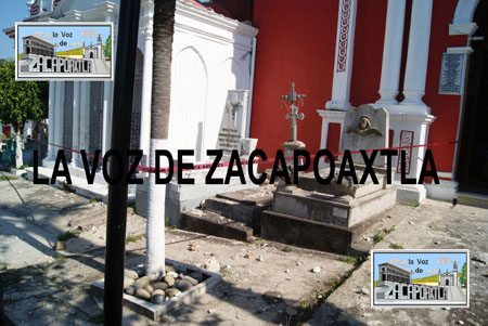 Aurora Juárez García, encargada del panteón, informó que la tarde de ayer se registró una tormenta eléctrica, la cual provocó caída de un rayo sobre la torre poniente de la iglesia y dañó parte de la torre, lo que generó la caída de piedras sobre las tumbas de las dos principales secciones del cementerio. Afirmó que de inmediato se dio aviso al ayuntamiento y personal de protección civil acudió al lugar y acordonó un área de aproximadamente 20 metros cuadrados porque se corre el riesgo de que continúan cayendo restos de la torre, en donde se encuentran dos campanas, una que fue construida en 1790 y otra que presenta una inscripción de 1960.