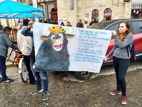 Los jóvenes llegaron hasta la entrada de la plaza de toros y dijeron que las corridas de toros representan una de las expresiones más crueles del hombre hacia los animales y por ello dijeron que es necesario que la mayoría de sociedad, tome consciencia del sufrimiento de los toros y que no se inculque en niños y jóvenes este espectáculo como diversión. A través de una pancarta, mostraron una frase del Premio Nobel de Literatura José Saramago, donde expresó: “Un animal no puede defenderse, si tú estás disfrutando con el dolor, disfrutando con la tortura, te gusta ver cómo está sufriendo ese animal, entonces no eres un ser humano, eres un monstruo”. Algunos de los asistentes a la corrida que protagonizaron los matadores Joselito Adame y Jerónimo, con seis toros del rancho de piedras negras, se acercaron a los jóvenes, los insultaron y les exigieron que se retiraran del lugar, inclusive los organizadores de la corrida, enviaron a una banda de música de viento a la entrada para que no se escucharan las expresiones en contra del evento. Los manifestantes dijeron que acudirán el próximo domingo doce de agosto a la misma plaza de toros, para llevar a cabo otra protesta, día en que se celebrará la segunda corrida de la feria con la presencia de los toreros Federico Pizarro y Octavio García “El Payo”.