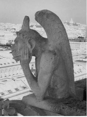 Detalle de 3 gárgolas ubicadas en el lado suroeste de la catedral de Notre Dame de Paris Por el contrario, las quimeras son estatuas de aspecto diabólico que solo tienen un efecto decorativo. Estas estatuas monumentales y grotescas fueron colocadas en lo alto del edificio para recrear la atmósfera fantástica que reinaba en la edad media. En la galería de las quimeras, hay una que es la más famosa de todas, se llama Stryge, un espíritu nocturno con un semblante parecido al de un vampiro.