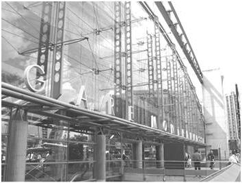 escaleras eléctricas, justo debajo de la ultramoderna pirámide de