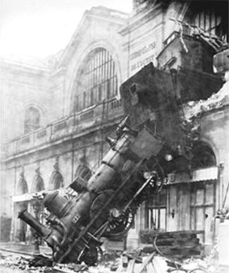 Es probable que usted haya visto en alguna parte la imagen anexa y haya creído que se trataba de un fotomontaje pero no es así, se trata de un accidente en la gare Montparnasse en 1895. Los frenos de aire comprimido de manufactura Westinghouse de la locomotora a vapor estaban defectuosos y el tren pasó de frente la señal de paro sobre la vía; Destrozó la fachada de la gare por el interior y la locomotora cayó estrepitosamente al nivel de la calle. Si, los trenes de esta gare arriban y parten desde el 2do. piso aun hoy en día.