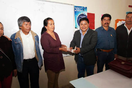 En primera instancia, el Presidente y su equipo de trabajo visitaron la Telesecundaria Netzahualcóyotl, en donde entregó el cheque por 10 mil pesos al comité deportivo de la Zona 020 de Telesecundarias, recursos que serán utilizados para cubrir los gastos de premiación de un evento multidisciplinario en donde participaran los alumnos de 13 planteles escolares en diversas áreas de competencia como comprensión lectora, ortografía y ajedrez. Los directivos de esta escuela esperan la participación de más de 300 personas entre alumnos, docentes y padres de familia.