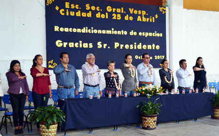 Para este evento, docentes, alumnos y padres de familia se reunieron en el auditorio de la escuela y llevaron a cabo un programa cívico social, a través del cual la directora Rocío Cárcamo García, expresó que la escuela se encontraba de fiesta, no solo por la entrega del módulo de sanitarios, sino el respaldo permanente del Ayuntamiento 2014 – 2018. La directora dijo que los alumnos de este plantel, no cuentan con recursos económicos para la aportación de cuotas, tal como lo realizan en otras instituciones de la cabecera municipal, sin embargo, dijo que merecen instalaciones dignas y mejores ambientes de aprendizaje, por lo que agradeció al edil Guillermo Lobato el respaldo hacia esta escuela.