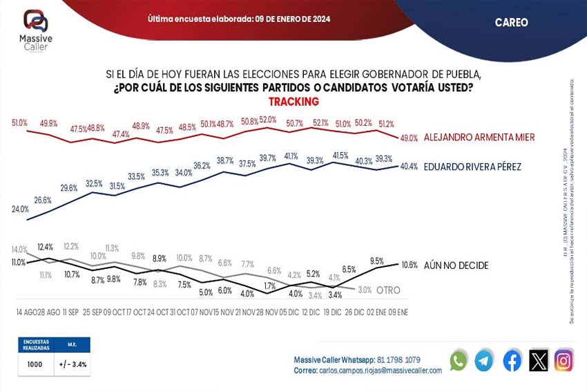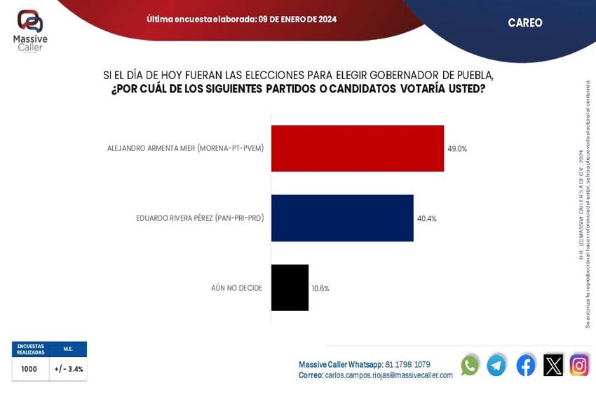 Hasta el 9 de enero, Massive hizo el conteo final preguntándole a los habitantes por cuál de los partidos políticos  o candidatos ejercería su voto. Un total del 49 por ciento se inclina hacia MORENA con su candidato único a la gubernatura de Puebla, Alejandro Armenta, por otro lado, el 40.4 por ciento ejercerá su voto por la coalición PAN, PRI, PRD y PSI, con su candidato único, Eduardo Rivera. Mientras que un porcentaje del 10. 6 por ciento aún no decide a qué candidato le dará su voto en las próximas elecciones en junio del 2024.