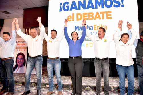 Al concluir el debate 2018, Martha Erika se reunió con los candidatos a Senadores, Diputados Federales, Diputados Locales, Ayuntamientos, así como amigas y amigos a quienes agradeció su apoyo en este trayecto en el que ha recorrido los municipios y ha escuchado las necesidades de los ciudadanos. De igual forma, indicó que con este ejercicio ganó Puebla y ganaron los ciudadanos, una vez que este permitió contrastar ideas y hablar de propuestas. “Amigas y amigos estamos prácticamente en la recta final, por alcanzar el triunfo pero hoy más que nunca debemos cerrar filas, debemos de trabajar incansablemente hasta el último minuto que nos lo permita la ley”. En este sentido, Alonso Hidalgo indicó que continuará recorriendo el estado hasta lograr el objetivo, por lo que instó a los presentes a no bajar la guardia y a cerrar filas para alcanzar la victoria el próximo 1ro. de julio. Finalmente, señaló que actuará con firmeza, para hacer valer el estado de derecho y garantizar la paz y tranquilidad de los poblanos. Cabe destacar que la acompañaron los candidatos Eduardo Rivera, Nadia Navarro, Mario Riestra, Roxana Luna, Roberto Ruiz Esparza, Jorge Aguilar Chedraui, Lupita Arrubarrena, Mariela Solís, Blanca Jiménez, Verónica Carbarín, Oswaldo Jiménez, Genoveva Huerta, Alejandra Escandón y Jesús Zaldivar.