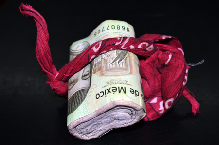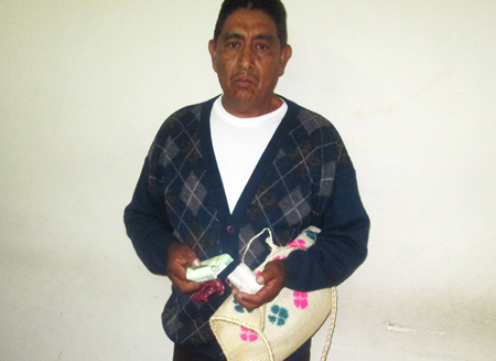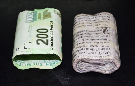 Este sujeto de 49 años de edad y con domicilio en calle Los Pinos sin número, colonia Bosques en Perote Veracruz, tenía en su poder un paquete grueso de papel con un billete de 200 pesos encima, además en un morral llevaba una cartera, un teléfono celular, más de 3 mil pesos en efectivo con billetes de diversas denominaciones, cuatro billetes de un dólar y un billete de dos dólares.